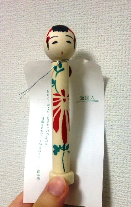 *ご存じない方のために ** 指で押さえているコケシの土台部分が螺子になっておりクルクルまわすと外れます、胴の中に巻物状の便箋が入っているのでそれにお手紙を書き土台螺子を戻し一緒付いている札に宛先を記入、札が外れないようしっかりとつけたら定型外料金分の切手を貼りそのままポストに投函できるそうです。すごい!