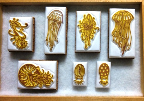 (既に何度か書いてますが)今の所メインはクラゲの消しゴムはんこです、けっこう細かい図案を時間を掛けてねちねちネチネチと彫っているので今までのイベント出展時に比べるとお値段がやや高めなんですよね、この頑張りを察してやってください・・・(汗;