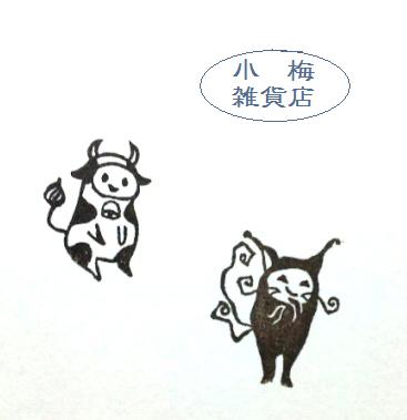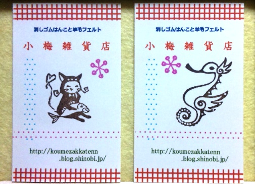 はんこ本体の画像はあるんですが長くなっちゃうのでカット、まあいろいろありますが販売用のはんこはこんな感じのものとか、かな~~~りテイストを変えてるものとかが合計100個、販売用でポストカード・ヒモ付きのミニカード・シール・小袋なんかの紙物を少々(本当に少々でございますことよ・・・)、 あと販売はしませんが小梅の作った羊毛人形と、鈴木先生の講座で知り合ったDROP+さんが小梅のモノノケはんこの猫又ちゃんを羊毛で作ってくれたのでそれを展示しております。