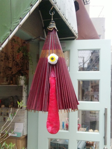 目玉とロングベロはお手製で後から傘に取り付けたんだそう、因みにベロの先の膨らみを押すと鳴ります、ピコピコサンダルみたい、皆さんも遊びに行かれたら店内に入る前に「ぴゃっぴゃっ」と鳴らして見ましょう。