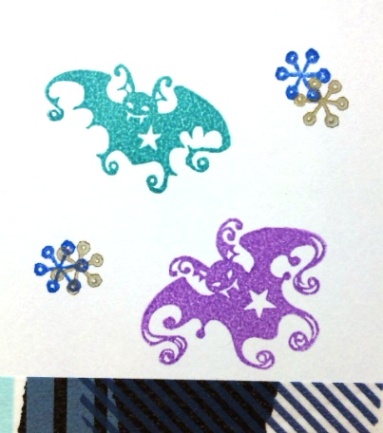 胸の★、最初は無かったんですがベタ面ばかりだと淋しいしのっぺりしすぎかなぁと思い抜いてみました、きっとこの辺が邪悪になりきれないとこなんだな、今度は♥に抜いたのも作ってみよう、そいでピンクのインクで押すのです。